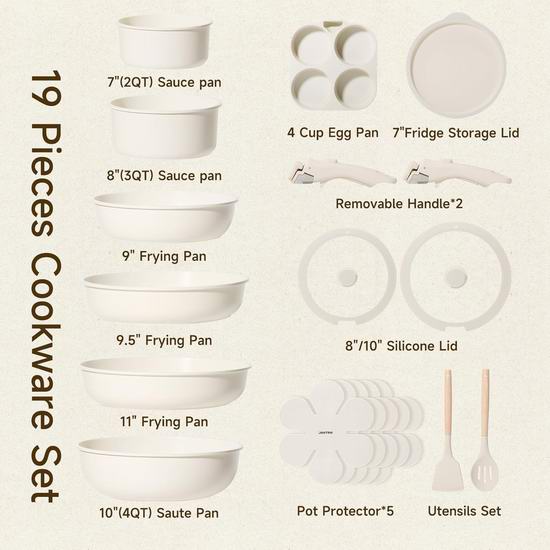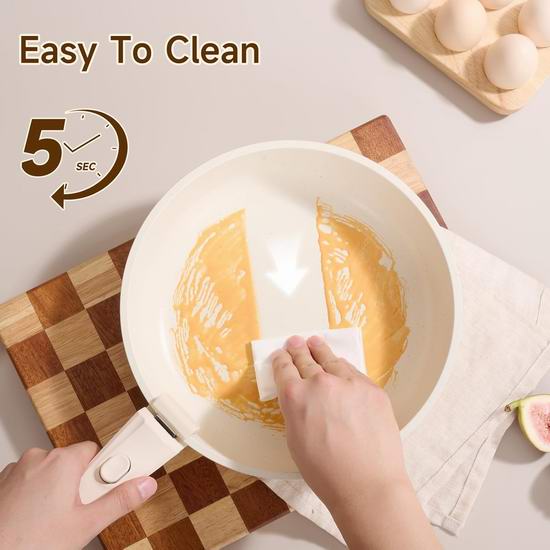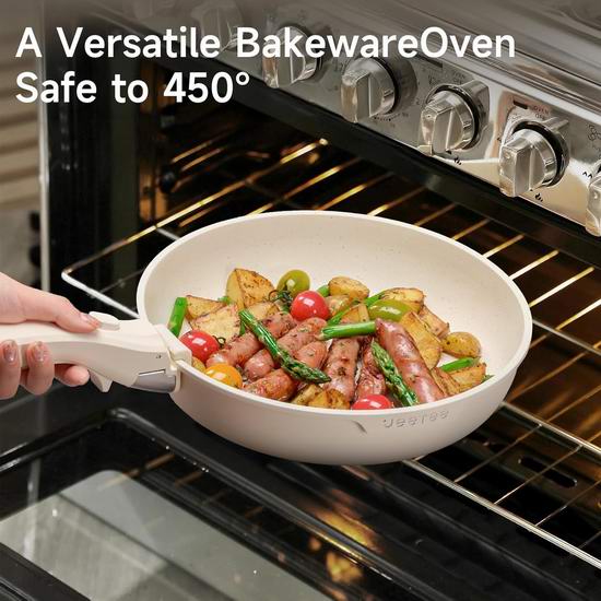采用优质不粘涂层,不含 PFAS、PFOA 和其他有害化学物质。烹饪时只需少量油,且只需少量擦洗即可轻松清洁,为您带来更健康、更便捷的烹饪体验。所有可拆卸手柄的锅碗瓢盆均可整齐叠放,节省75%的橱柜空间,让厨房井然有序。最高耐热温度可达 480°F(约 249°C),适用于烘焙、烤制和烧烤。它也适用于燃气灶、电炉和电磁炉。加热时请取下锅柄。可拆卸手柄,一键即可从各种炉灶转移到烤箱、冰箱,最后端上餐桌,省去购买烤盘/餐具套装的费用。套装包括2.0 夸脱和 3 夸脱汤锅、9 英寸、9.5 英寸和 11 英寸煎锅、4 夸脱炒锅、4 杯煎蛋锅、2 个可拆卸手柄、8 英寸和 10 英寸硅胶盖、7 英寸冰箱保鲜盖、2 件硅胶厨具和 5 个锅垫。