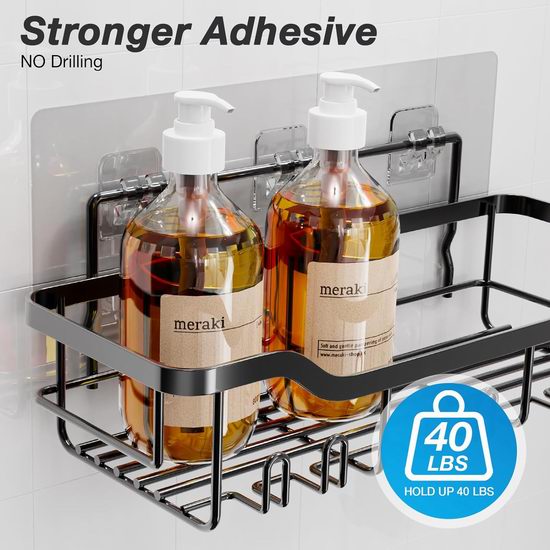 采用不锈钢材质,复古黑色饰面,坚固耐用,最大承重可达40磅,可用于收纳洗浴用品、化妆品、厨房用品、香料调料、生活办公用品等。安装时无需钻孔,只需将随附的强力胶贴粘在墙面,再将置物架挂在上面即可。