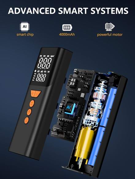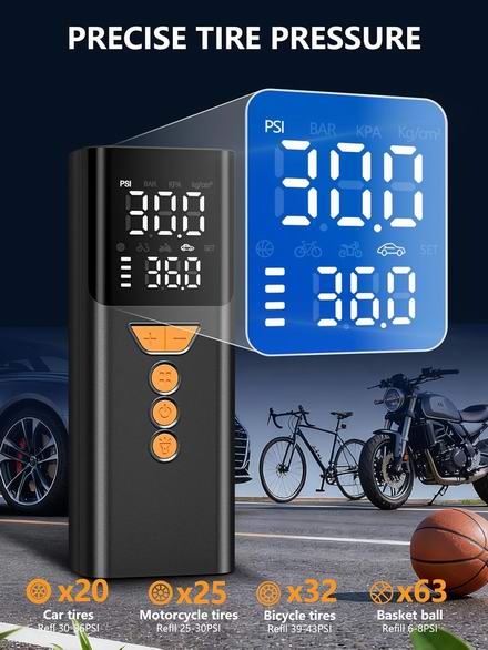 这款充气泵具有4+N智能模式,可用于汽车、摩托车、自行车、球类以及自定义充气。轻松切换压力单位(PSI、BAR、KPA、kg/cm²),并可预设3-150 PSI的压力,实现精准充气。内置4000mAh电池,充满电后可为8个汽车轮胎充气。