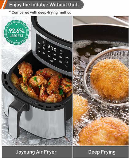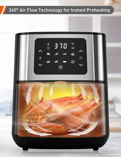 懒人、吃货神器,减肥中也能饱口福的两全选择,集空气炸、烘烤等多功能于一体。采用360°热风高速循环,逼出食物油脂,锁住汁水和营养,不放油或者放一点点油,就能通过高速、均匀地循环热空气,很快加热和脆化食物表面,达到油炸食品般的外焦里嫩口感,比传统的油炸减少高达93%的脂肪含量。满口香酥,却不用摄入普通油炸食品的大油量和卡路里。吃得美味无负担!数字控制,预设8个智能烹饪程序,支持1-60分钟定时关闭,烘培温度180-400⁰F自由调节,5.5升大容量,让你轻松就能制作出美味佳肴~配送食谱、烤箱手套、烤架、烤盘和披萨盘等配件。