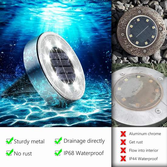 这款Jyoiat太阳能地灯,既可以埋在地面,也可以通过螺丝固定在木制台阶或甲板上。白天吸收太阳能,晚上自动为庭院、步道等提供照明。采用IP68防水等级,密封性佳,防潮防尘,适应雨雪霜冻等恶劣天气。每个灯内置8个LED灯珠,照明效果明亮,充足光照下可持续工作6-8小时,节能环保。非常适合装饰花园、庭院、小径等户外空间,轻松为夜景增添美丽。