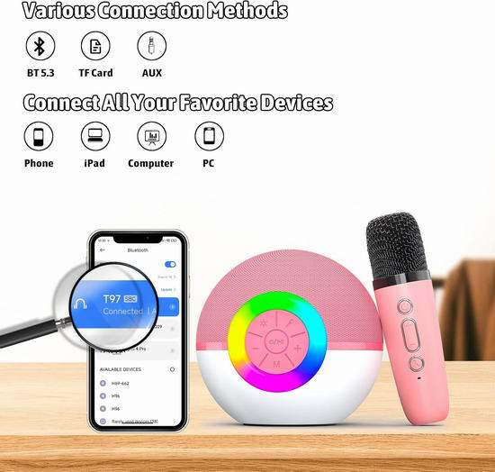 这款迷你卡拉OK机拥有水晶般清晰的音质,让您仿佛置身舞台。人声、回声和音量均设有独立控制,可以微调音效,打造完美表演。麦克风拥有6种神奇的变声效果,可以发出男人、女人、可爱宝宝、可怕怪物或酷炫机器人的声音。采用蓝牙5.3技术,能够快速稳定地与手机、iPad、PC 等设备连接。