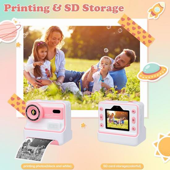 这款儿童即印相机配备即时自动打印功能和无墨安全打印纸,只需按下按钮即可打印高清“黑白”照片,记录孩子们身边的美好瞬间。此外,它还将彩色照片存储在 32GB SD 卡上,方便日后使用。相机套装还附赠5支彩笔和贴纸,孩子们可以选择自己喜欢的贴纸和彩色笔来装饰打印的照片,激发他们的创造力和想象力。相机配备2.4 英寸屏幕、前后双镜头、1080P 视频摄像机、10 倍数码变焦和 48m 可调相机分辨率、即时打印、2.4 英寸屏幕、1080P 视频录制、16 倍数码变焦、连拍、滤镜框、闪光灯、延时摄影和 mp3 播放器等多种功能,可满足儿童的不同需求。