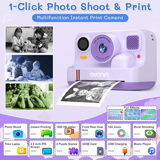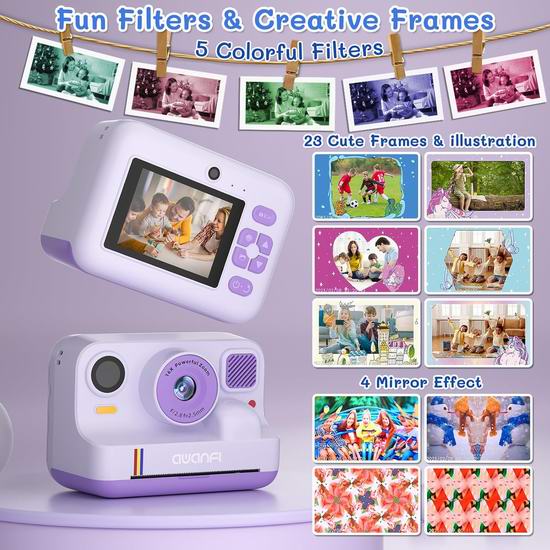 历史新低!AWANFI 4800万像素 即时打印 儿童拍立得数码相机6.5折 38.99加元包邮!