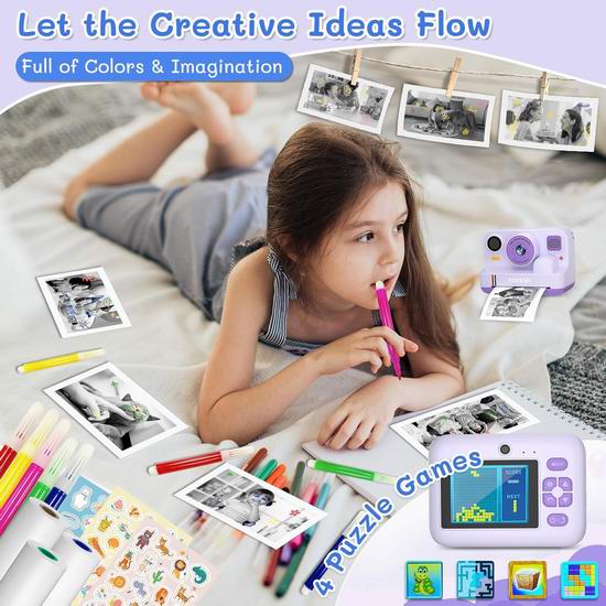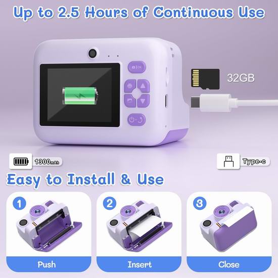 这款升级版儿童即时打印相机集儿童数码相机和便携式照片打印机于一体,可让孩子在1秒内打印黑白照片,同时还能将彩色高清照片和1080P视频保存到32GB SD卡中。拥有两种打印模式(点阵和灰阶)和5级色彩深度,激发孩子们的创作灵感。采用热敏打印技术,无需墨粉或墨水。相机内含3卷打印纸(黑白、蓝色、绿色),让孩子们可以尽情打印更多精彩照片。不仅可以打印照片,还具备1080P高清视频录制、2.4英寸大屏幕、前后双镜头、闪光灯、16倍数码变焦、延时摄影、连拍、趣味相框和滤镜、MP3音乐播放器以及内置益智游戏等功能。内置1300mAh可充电电池,支持长达2.5小时的连续使用。预装的32GB SD卡可存储数千张照片和视频,让孩子们可以自由拍摄和打印。