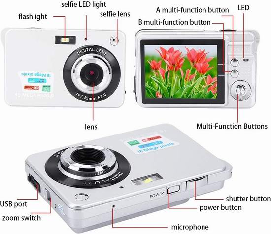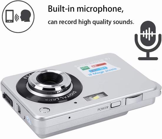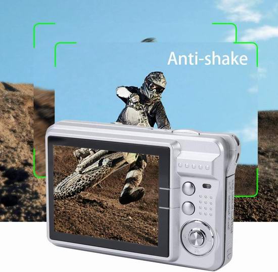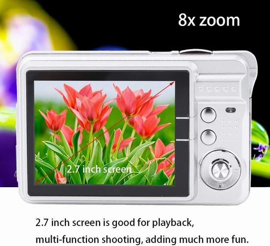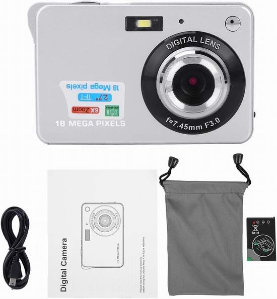 这款相机采用优质塑料外壳,安全坚固耐用。搭载2.7英寸屏幕,可选择不同场景模式,例如自动夜景、夜间人像、风景、运动、派对、海滩等。自动开关机,内置麦克风,可录音录像。配有腕带,可保护相机免受跌落和损坏。