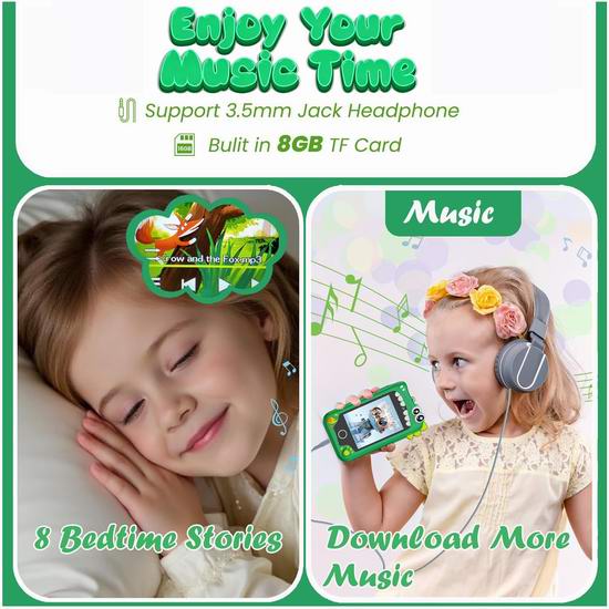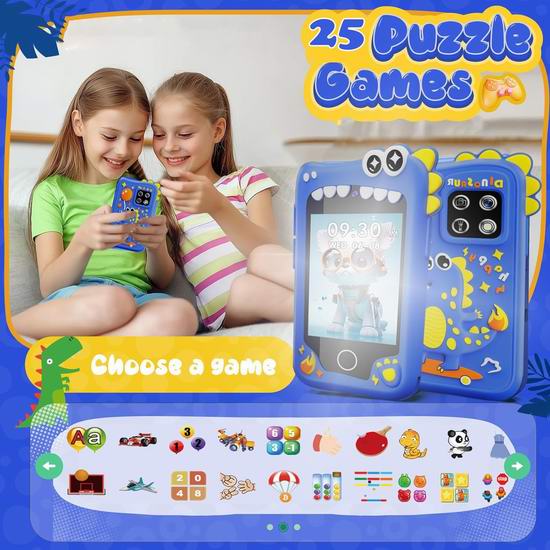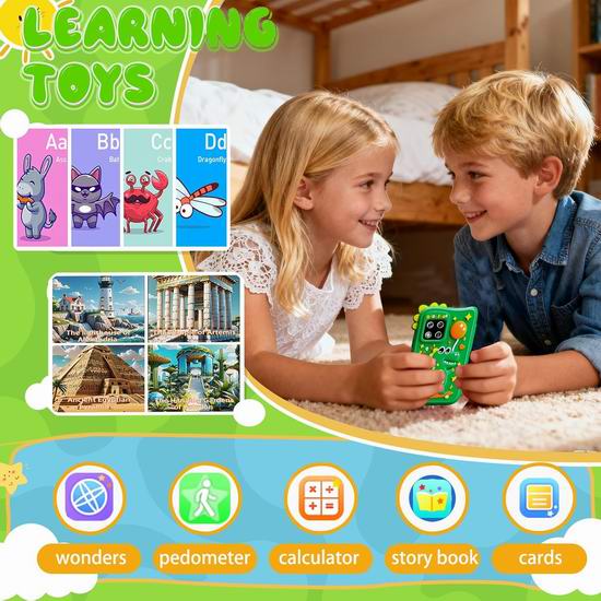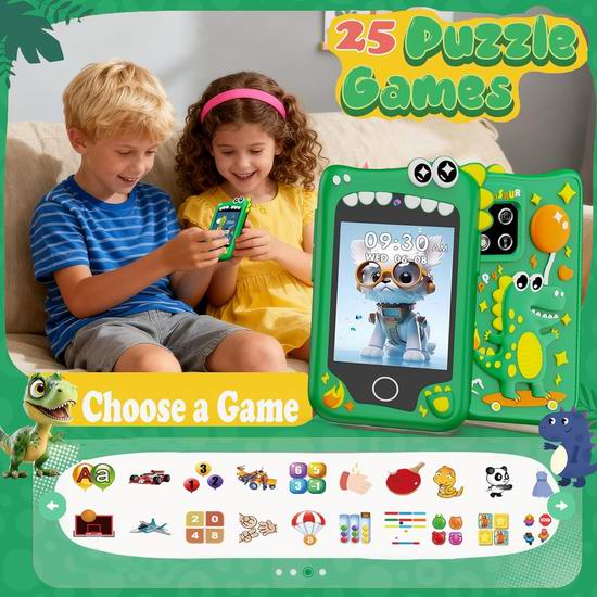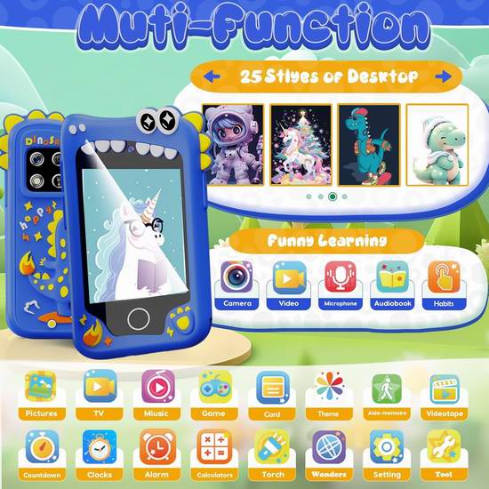 这款多功能儿童学习智能手机,搭载2.8英寸IPS触摸屏,集ABC学习、习惯追踪、音乐播放器、计算器、日历和手电筒于一体。配备前后摄像头、视频录制功能以及10款趣味照片贴纸,激发孩子的创造力和故事讲述能力。随附的8GB存储卡可用于储存照片和视频。内置28款益智游戏,旨在培养孩子的记忆力、逻辑思维和问题解决能力。配备家长控制功能,有效管理屏幕时间和防成瘾功能,是3-10岁儿童安全有趣的学习方式。内置MP3播放器,支持通过耳机插孔或内置扬声器播放高品质音频。口袋大小设计,易于使用和携带,硅胶保护套提供有效的防摔保护。