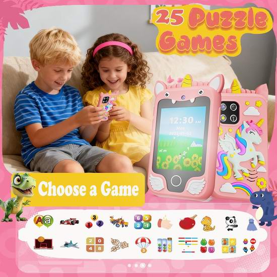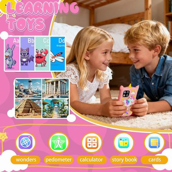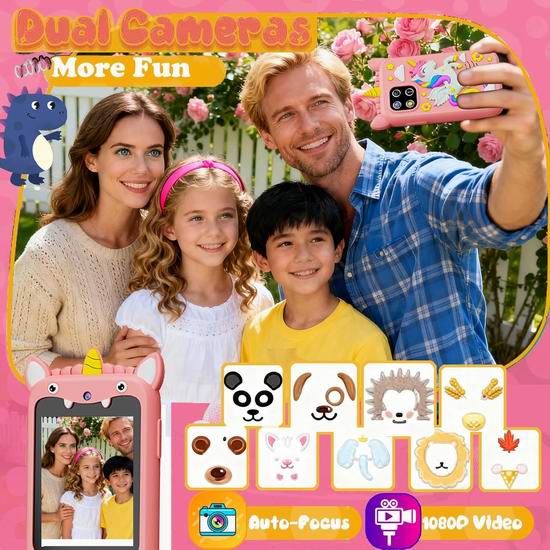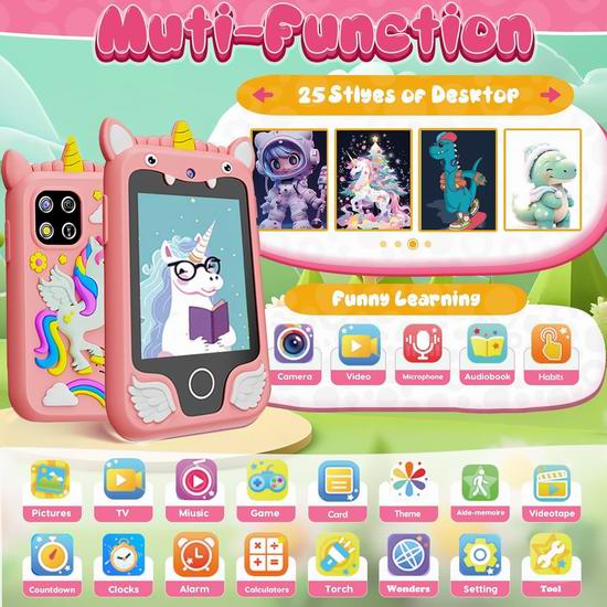 这款儿童智能手机拥有2.8英寸IPS触屏,集ABC学习、习惯追踪、音乐播放器、计算器、日历和手电筒于一体。配备前后摄像头、视频录制功能以及10款趣味照片贴纸,激发孩子的创造力和故事讲述能力,随附的8GB存储卡可存储数百张照片和视频。内置28款益智游戏,旨在培养孩子的记忆力、逻辑思维和问题解决能力。配备家长控制功能,有效管理屏幕时间和防成瘾功能,是3-10岁儿童安全有趣的学习方式。MP3播放器支持通过耳机插孔或内置扬声器播放高品质音频。