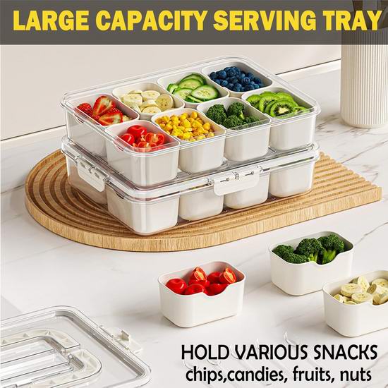 这款水果干果零食分类收纳盒,配有盖子和手柄,内含8个隔间,可轻松分开存放不同的水果和零食。密封硅胶圈和四面扣设计提供双重保护,有效防止空气和灰尘进入,保持食物新鲜。采用优质PP和PET材料制成,不含BPA,可放心储存水果、坚果、熟食等。