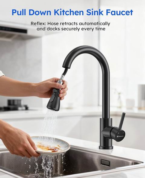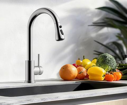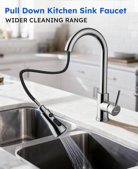 采用优质 304 不锈钢主体与再生尼龙纤维拉绳,不含铅、耐用安全;配备升级防滴漏陶瓷阀芯与抗老化密封圈,通过 50 万次测试,防漏性能可靠。下拉喷头支持三种出水模式(直流、喷雾、暂停),水流集中不易飞溅,适用于厨房、洗衣房、房车和酒吧等多种场景。安装便捷,约 15 分钟即可完成,兼容单孔与三孔水槽,并可选配装饰面板。现代简约外观搭配防指纹表面处理,轻松擦拭即可保持洁净,与多种家居风格完美融合。