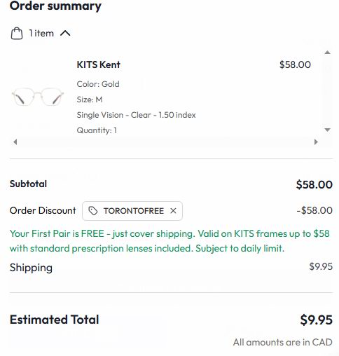 KITS网店销售,新用户购买指定款镜框(原价需低于58加元的才免费,也就是显示的促销价低于20元可以免费购买),并在线配眼镜(需选择最基础的免费镜片,可配度数),在购物车内使用折扣码:TORONTOFREE 结账免费,运费9.95加元;