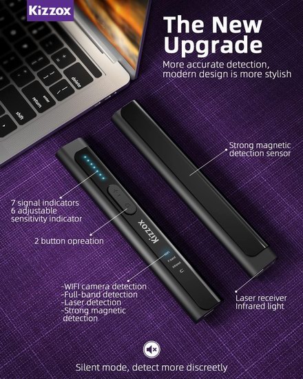 这款便携式探测器小巧便携,外形大小如同一支笔,采用新一代升级微处理器芯片,特别增加红外激光检测+强磁检测,工作更准确,抗干扰能力强,超长探测范围,可快速检测到附近的无线隐藏摄像头、蓝牙、WiFi信号、VHF/UHF发射器、GSM/3G/4G窃听器、GPS跟踪器、无线信号源和增强磁场信号等,检测频率1MHZ~6.5GHZ,检测范围5厘米至15米,扫描速度1500次/秒,支持6级灵敏度,USB充电1小时,续航可达24小时,适合出差、旅行期间入住酒店、宾馆、民宿个人隐私保护检测使用,帮你快速找到隐藏摄像头,保护个人隐私及商业信息安全。