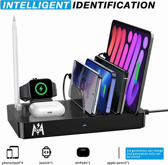 此款充电座通过FCC、CE、ETL、WEEE认证,内置自适应智能快速充电芯片,具有3个USB充电口和1个USB-C充电口,内置苹果手表、手写板及耳机充电座。创新挡板设计,便于整理放置手机、平板等设备,具有过热、过流、过充、短路保护。