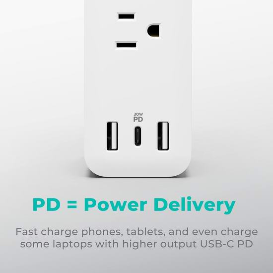 这款插线板配备USB-C PD充电口,可提供30W电力传输,比传统充电方式速度提升3倍,支持快速为手机、平板电脑充电,甚至可为部分笔记本电脑供电,插座间距大,插头之间不会相互阻碍。内置2 个 USB-A 充电口和 1 个 USB-C PD 充电口。低调扁平插头设计,适合放置在家具后方,电源线长达6英尺。内置980焦耳浪涌保护,有效保护敏感电子设备,确保安全使用。UL/ETL认证,电气额定值 15A、125V、50/60Hz、1875W,符合高标准安全规范。KMC 设备提供美国本地技术支持和终身保修。