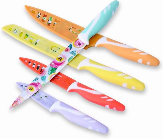 这款彩色厨房刀具套装采用高碳不锈钢制成,刀刃锋利、经久耐用,刀片涂有耐用的不粘涂层,不仅防止食物粘附,还能有效抵御腐蚀和生锈。颜色编码的设计便于区分不同用途。人体工程学手柄设计使刀具握持舒适,切割时控制更稳定,是厨房中的得力助手。套装包含厨师刀、面包刀、切肉刀,多用刀和削皮刀,满足切片、切丁、切割等各种需求。每把刀均配有防护刀套,存放安全便利。