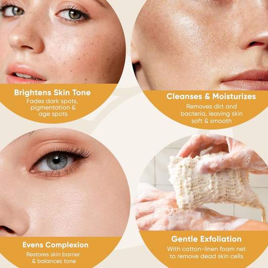 这款淡斑香皂蕴含曲酸和姜黄成分,有助于减少色斑和色素沉着,同时均匀肤色。能深层清洁杂质,去除细菌,并提供持久保湿,令肌肤柔软光滑。采用三重亮肤配方:曲酸、姜黄和烟酰胺。曲酸抑制酪氨酸酶活性,帮助防止黑色素生成;烟酰胺减少黑色素向皮肤表面的转移,加速现有色素沉着的淡化;姜黄提取物有助于阻断​​紫外线诱导的黑色素合成,促进肤色更加均匀透亮。蕴含曲酸、姜黄提取物、烟酰胺、胶原蛋白、透明质酸、茶树油、椰子油、乳木果油、荷荷巴油、维生素C和维生素E。不含硫酸盐、对羟基苯甲酸酯和其他刺激性化学物质。温和有效,适用于所有肤质,男女老少皆宜。附送起泡海绵,可在数秒内产生丰富细腻的泡沫,深入毛孔,有效去除污垢、死皮细胞、多余油脂和残留物,带来彻底清洁的体验。