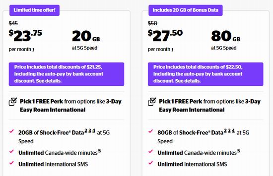 25GB流量(需选择自动付费)+无限加拿大通话+无限国际短信,月费仅23.75加元;