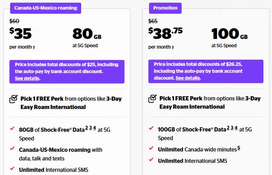 加美墨漫游80GB流量(需选择自动付费)+无限加美墨通话+无限国际短信,月费仅35加元;