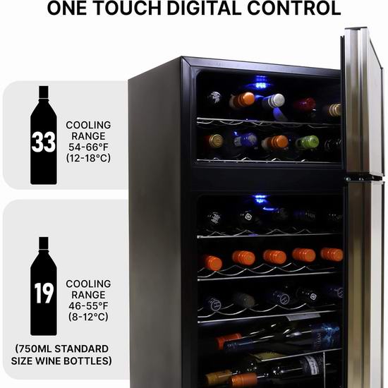 这款葡萄酒冷藏冰箱容量为29瓶,五个金属架可移动或拆卸,以适应不同尺寸和形状的酒瓶。配有双区域冷却功能,上层温度为54-66°F(12-18°C),下层为45-55°F(7-12°C),为葡萄酒提供理想的储存环境。高性能压缩机系统冷却高效且低噪音,提供可靠的存储体验。冰箱采用双层钢化玻璃门,不锈钢装饰,双门可单独开启以减少温度变化。外部触摸屏控件方便调节温度和内部照明。柔和的LED室内照明凸显葡萄酒收藏的同时,不会产生多余热量。双层玻璃门的着色设计可保护葡萄酒免受紫外线的损害。