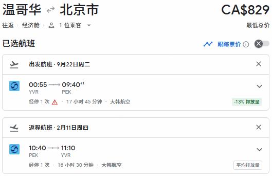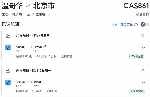 春季出发,温哥华往返北京票价861加元:
