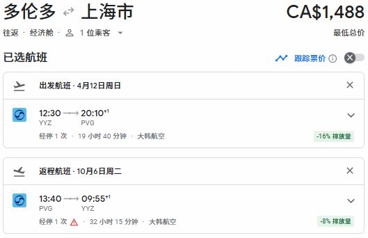 春季出发,多伦多往返上海票价1488加元: