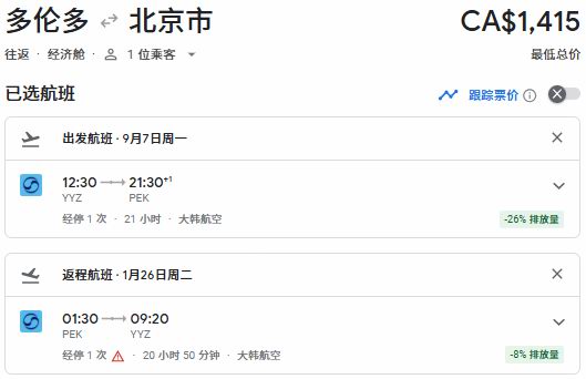 秋季出发,多伦多往返北京票价1415加元: