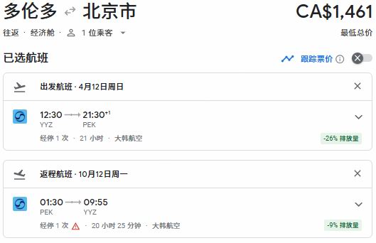 春季出发,多伦多往返北京票价1461加元: