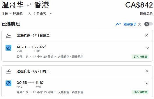 秋季出发,温哥华往返香港票价842加元: