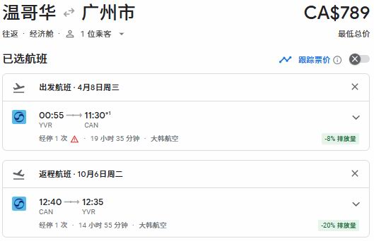 春季出发,温哥华往返广州票价789加元: