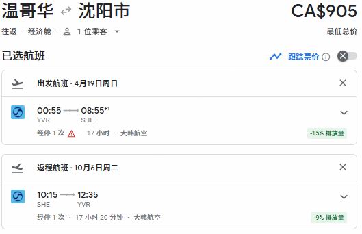 春季出发,温哥华往返沈阳票价905加元: