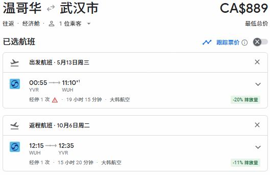 春季出发,温哥华往返武汉票价889加元: