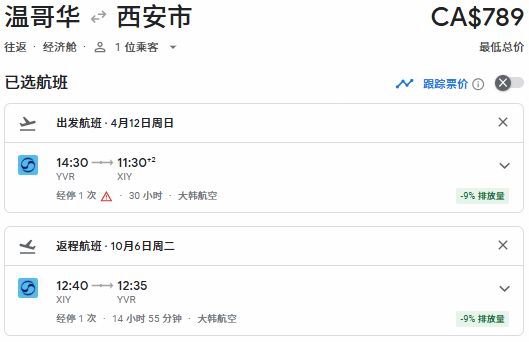 春季出发,温哥华往返西安票价789加元: