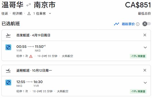 春季出发,温哥华往返南京票价851加元: