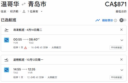 春季出发,温哥华往返青岛票价871加元: