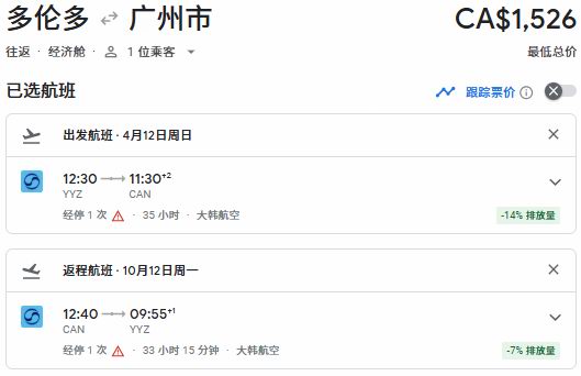 春季出发,多伦多往返广州票价1526加元: