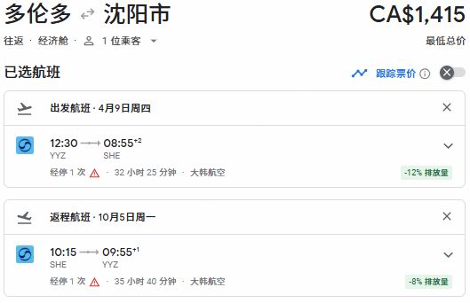 春季出发,多伦多往返沈阳票价1415加元: