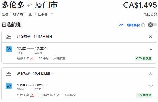 春季出发,多伦多往返厦门票价1495加元: