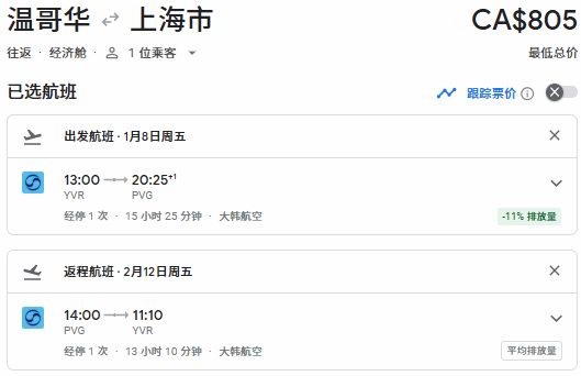 冬季出发,温哥华往返上海票价805加元: