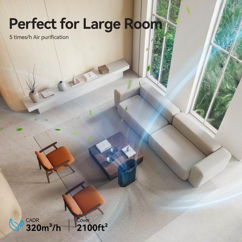 专为最大2100平方英尺的空间设计,配备四档风速,强劲模式下每小时可净化空气五次。核心过滤系统采用三重滤网结构预过滤网捕捉大颗粒灰尘和毛发,H13级HEPA滤网去除99.97%的烟雾、花粉等微粒,活性炭滤网有效吸附宠物异味和有害气体。设备内置PM0.3空气质量传感器,可在自动模式下智能调节风扇转速。睡眠模式下噪音低至20分贝,配有儿童锁7色RGB氛围灯。产品通过CARB、EPA和FCC认证。