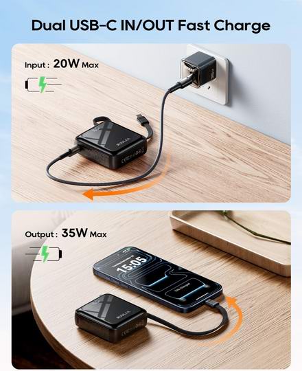 超紧凑设计,信用卡大小的机身,可轻松放入口袋或小包中,使其成为一款真正小巧便携的移动电源。支持高达35W USB-C快充,为手机和平板电脑提供比标准18W充电器明显更快的充电速度。具有10000mAh大容量,满足日常用电需求,足够可为大多数智能手机充满电。集成式 USB-C 数据线专为频繁使用而设计,无需携带额外的数据线,同时提供便捷可靠的充电体验。