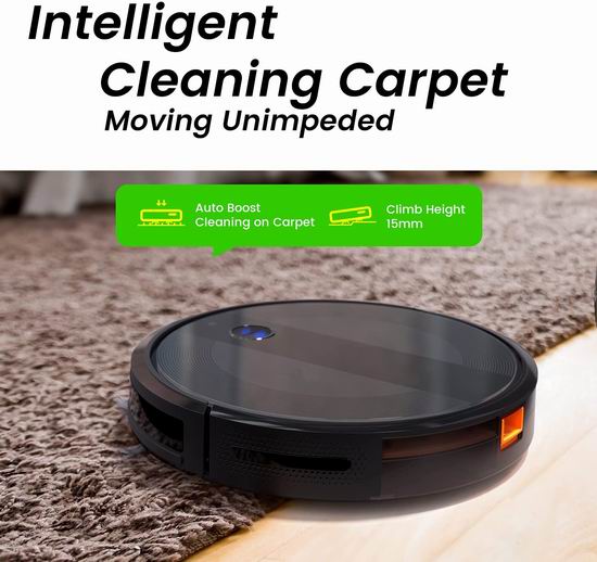 全新2.85英寸超薄设计,防刮钢化玻璃顶盖,拥有2000Pa Max超强吸力,55dB静音运行,内置Wi-Fi,支持手机远程遥控,支持Alexa和谷歌助手语音控制。充满电后,续航时间长达150分钟,可以设置边界条,限制清洁区域。