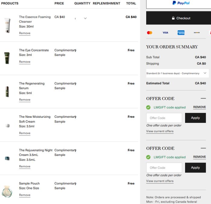 La Mer网店销售,购买价值40加元30ml洗面奶,使用折扣码:LMGIFT 送3件套日夜护肤大礼包,结账时自选2小样,全场包邮。点击进入订购页面