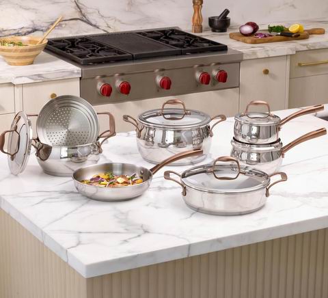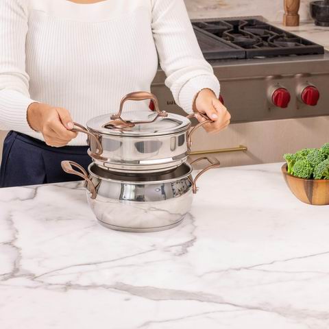 采用优质不锈钢材质与Lagoseal Plus复合锅底,确保快速均匀导热并适用于包括电磁炉在内的所有热源;其铆接防烫手柄、防滴漏锅沿及可入烤箱设计(最高204°C)兼顾安全与多功能性,配合密封锅盖有效锁鲜,需手洗以保持青铜色外观光泽。套装包括:14 厘米带盖汤锅(1.25 升)、16 厘米带盖汤锅(1.7 升)、20 厘米带盖汤锅(3.3 升)、24 厘米带盖荷兰锅(3.5 升)、26 厘米带盖砂锅(5.9 升)、24 厘米煎锅、20 厘米蒸笼。:14 厘米带盖汤锅(1.25 升)、16 厘米带盖汤锅(1.7 升)、20 厘米带盖汤锅(3.3 升)、24 厘米带盖荷兰锅(3.5 升)、26 厘米带盖砂锅(5.9 升)、24 厘米煎锅、20 厘米蒸笼。