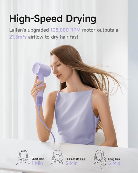 Laifen 莱芬SE 2高速吹风机搭载108,000转/分钟无刷电机,风速高达21.5米/秒,干发速度比传统吹风机快3.5倍。内置负离子发生器可释放2亿负离子,有效抚平毛躁、提升光泽。配备10种风温风速组合(含儿童模式),智能温控每秒80次精准调温,避免热损伤。整机仅重390克,噪音约59分贝,并配有2个磁吸风嘴,兼顾高效干发、护发与静音体验。