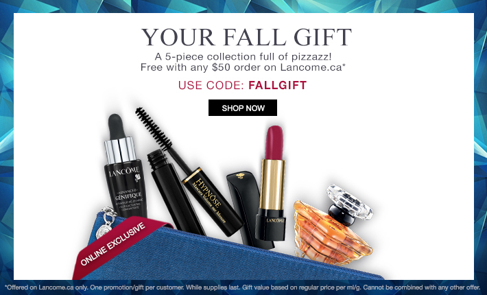 Lancome官网销售,感恩节周末使用折扣码:THANKS 全站8.5折,使用折扣码:FALLGIFT 满50元送5件套礼品,满35元可以2.5折价格55元购买限量版套装(满35元页面弹出菜单提示),运费6.95元,满85元包邮,点击进入订购页面。