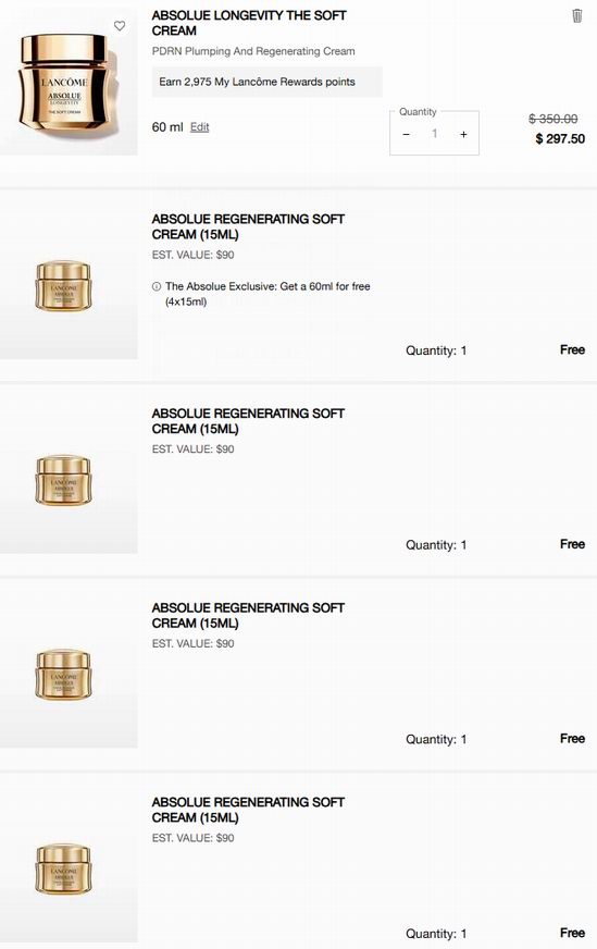 Lancome网店销售,3月21日凌晨3点前,购买Soft升级版菁纯逆龄面霜60ml 或 rich滋润版菁纯面霜60ml 送4件15ml菁纯面霜;