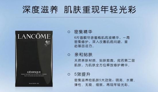 兰蔻精华肌底液 (Lancome Genifique) 轻薄透气的生物纤维面膜如同人的第二层肌肤,完美贴合,毫无保留地呵护每处肌肤轮廓,高效专利活性成分能迅速渗入肌肤深层,有效激活年轻基因,使用后更赋有极佳的保湿效果,同时,创新免洗配方使女性能够在使用后立刻继续晨妆和晚妆程序。生物纤维质地柔软,有卓越的清凉舒缓功效,并且能使精华成分瞬间被肌肤吸收,迅速融入肌肤深层。