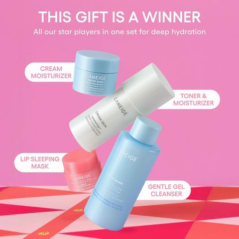 LANEIGE 保湿旅行四件套以可重复使用的蓝色网状旅行袋包装,内含洁面乳、爽肤水、保湿霜和睡眠唇膜,为肌肤带来强效清洁、深层补水与柔润修护。日常使用只需早晚洁面、爽肤、保湿,睡前加敷唇膜,即可让肌肤长效水润透亮、双唇柔软滋润,是旅行携带、送礼或日常护肤的理想选择。