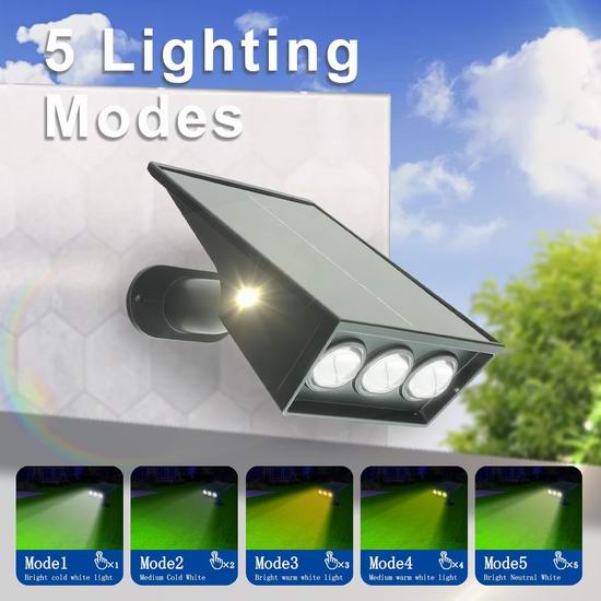 这款太阳能户外射灯采用高强度ABS材料制成,可承受-10℃至50℃的极端温度,具有IP65防水等级。无惧暴雨、暴雪、强风、霜冻和高温侵袭,专为户外环境设计。一键切换5种照明模式:高亮冷白光、中亮冷白光、高亮暖白光、中亮暖白光和高亮中性白光,适应不同场景需求。配备了30%高转换率玻璃太阳能电池板和1500mAh储能电池,确保太阳能户外灯整夜明亮。支持地插和壁挂两种安装方式,即插即用。