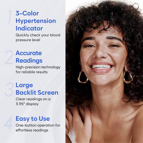 此款血压计采用一体式测量技术,一键式操作,全自动测量血压和心跳速率,易读大屏幕,读数准确,对血压进行3种背光颜色提示(绿色正常,橙色为高血压前期,红色为高血压),并具有心律失常提醒,可储存2个用户共计120组测量数据,智能计算最后三次平均值。紧凑型设计,配送便携盒,方便随身携带,采用4节AA电池供电(自带)。